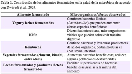 Los alimentos fermentados pueden afectar la microbiota intestinal de una forma muy positiva y deben ser considerados un elemento importante en la dieta humana por sus microbios vivos (probióticos) (Sukmawati et al., 2021; Melini et al., 2023), como se resume en la Tabla 1.
