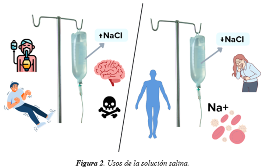 Por lo regular, el suero fisiológico es apto para la mayoría de las personas, sin causar alergias o irritaciones, en la Figura 2 se ejemplifican los principales usos de solución salina con fines médicos. Sin embargo, el uso de este recurso puede ser contraproducente para personas con hipersensibilidad a los componentes del suero, pacientes o con hipernatremia (alteración de electrolitos con alto nivel de sodio), durante el embarazo y pacientes con hipertensión no controlada. Una parte importante por rescatar de la fácil receta para formar esta solución es que, aunque suena sencillo mezclar agua con sal, el suero debe de ser estéril para evitar alguna infección, preparar esta solución de manera casera no garantizaría la calidad, esterilidad y la concentración adecuada, por ello, es importante adquirir este tipo de productos en establecimientos pertinentes.